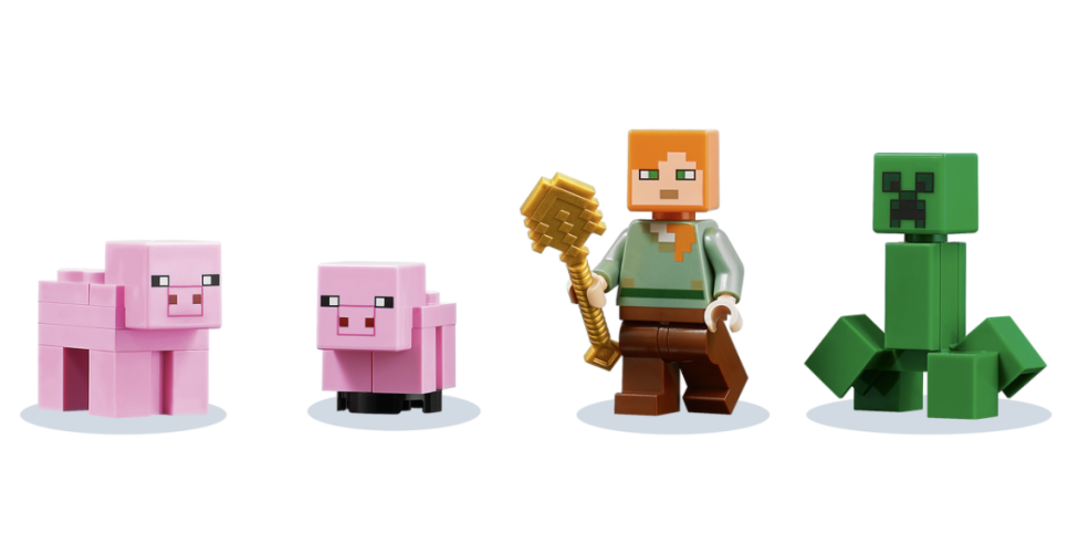 사실감 넘치는 레고® 마인크래프트™ 조립 플레이 세트와 함께 인기 게임 캐릭터 알렉스, 유명한 몬스터 크리퍼™, 돼지 2마리, 알렉스의 액세서리, 돼지에게 줄 당근이 들어 있습니다.